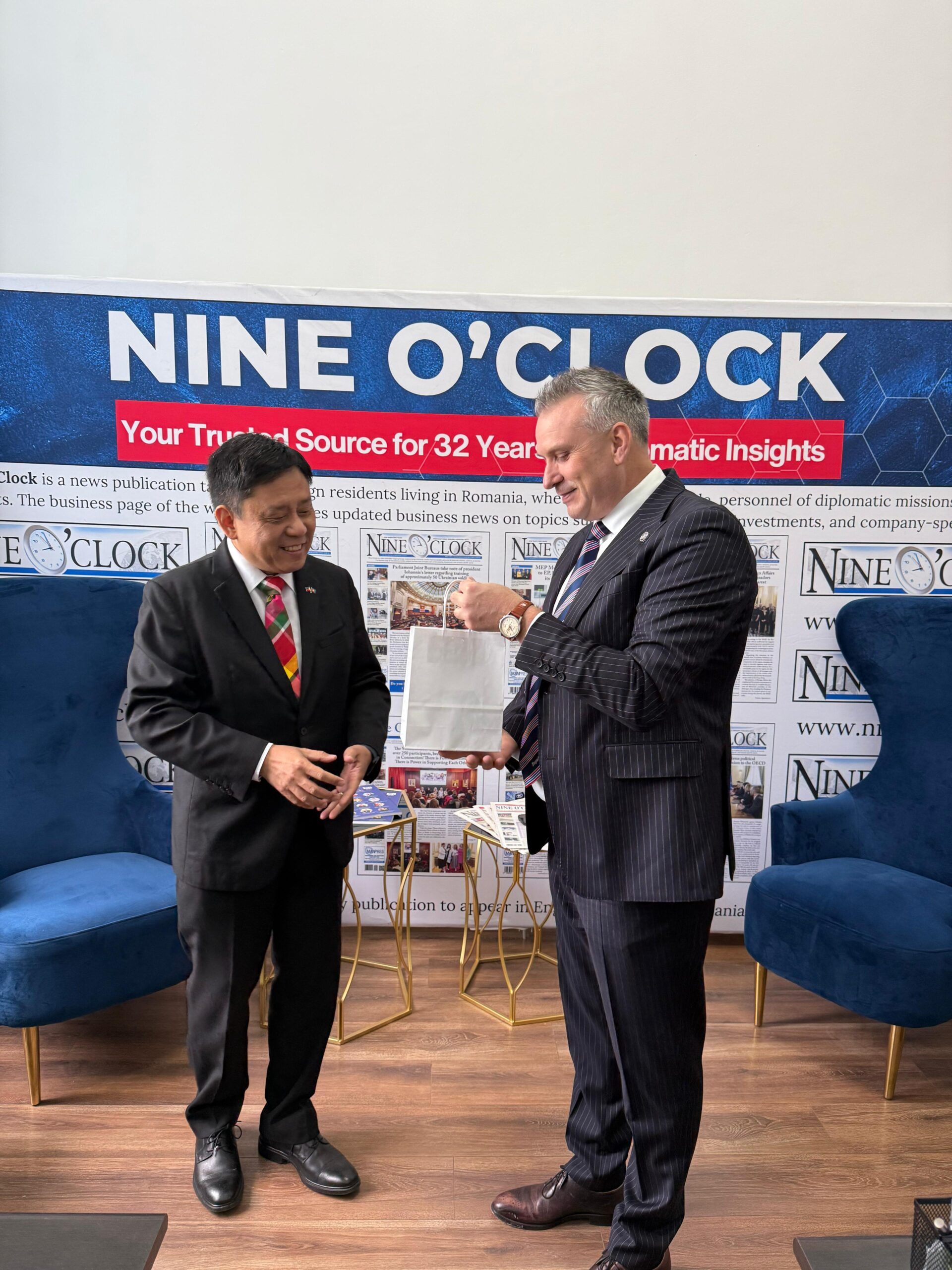 Pe 12 mai 2025, Ambasadorul Republicii Filipine în România, Excelența Sa Noel Servigon, a vizitat redacția cotidianului Nine O’Clock, unde a fost primit de CEO-ul publicației, domnul Mihai Manea.