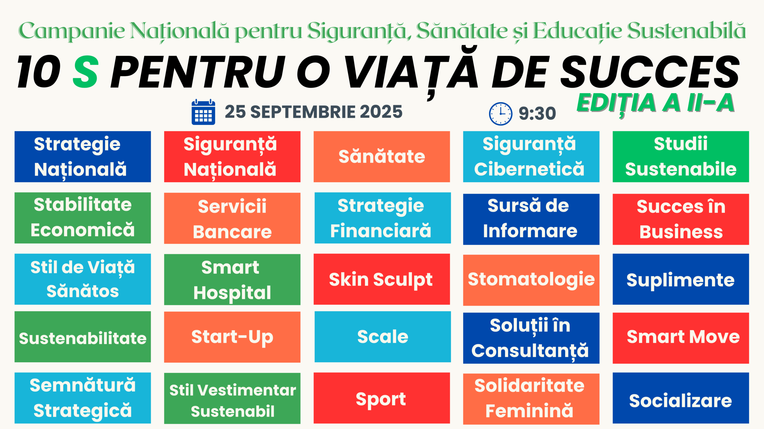 Conferința Națională „10 S pentru o Viață de Succes” revine cu ediția a II-a pe 25 septembrie 2025 După succesul primei ediții desfășurate în iunie, Conferința Națională „10 S pentru o Viață de Succes” revine pe 25 septembrie 2025, cu un nou maraton de idei, soluții și viziuni pentru un
