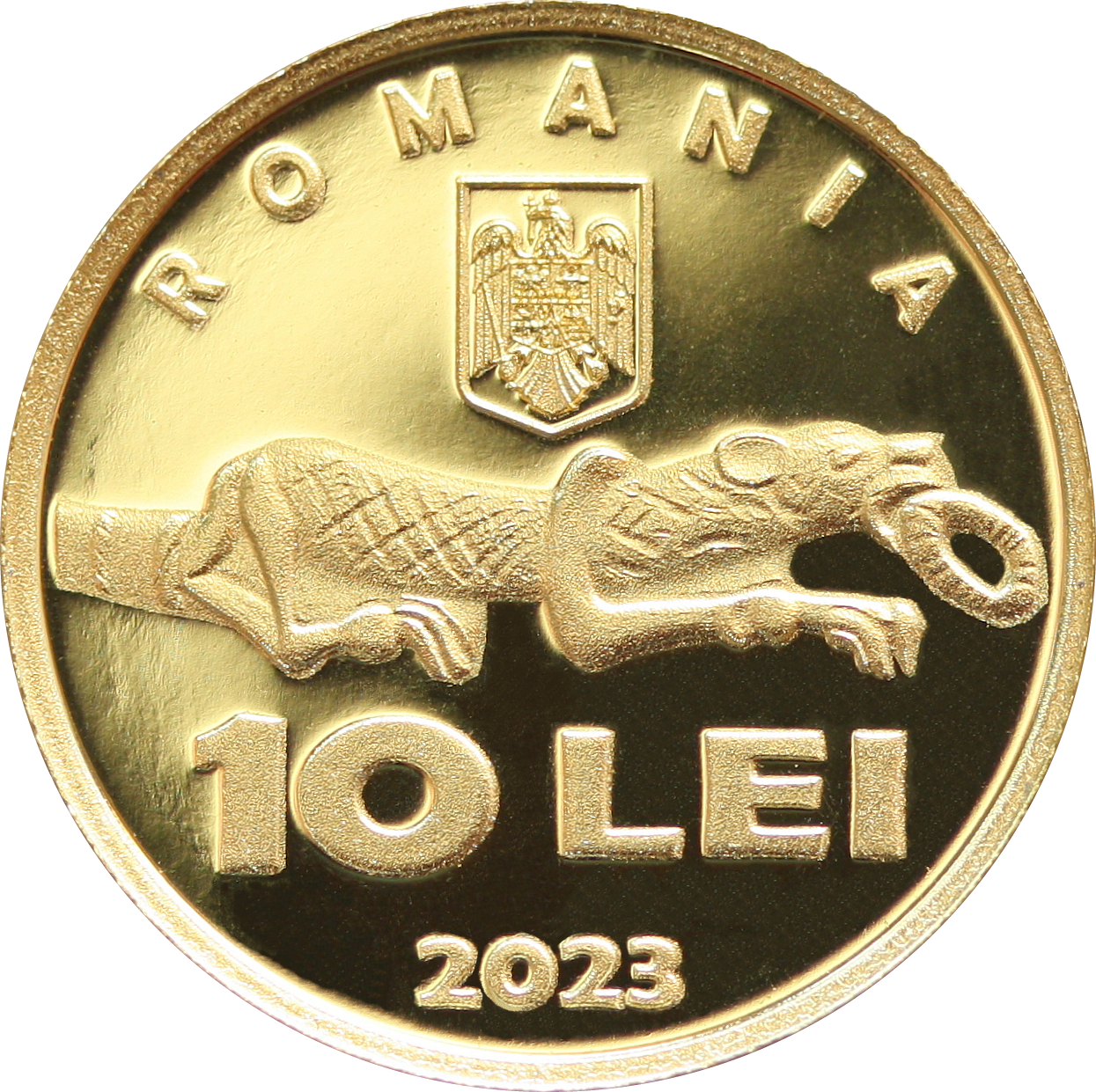 Aversul monedei prezintă una dintre extremitățile în formă de animal a diademei princiare de la Bunești-Averești, inscripția „ROMANIA” în arc de cerc, stema României, valoarea nominală „10 LEI” și anul de emisiune „2023”.